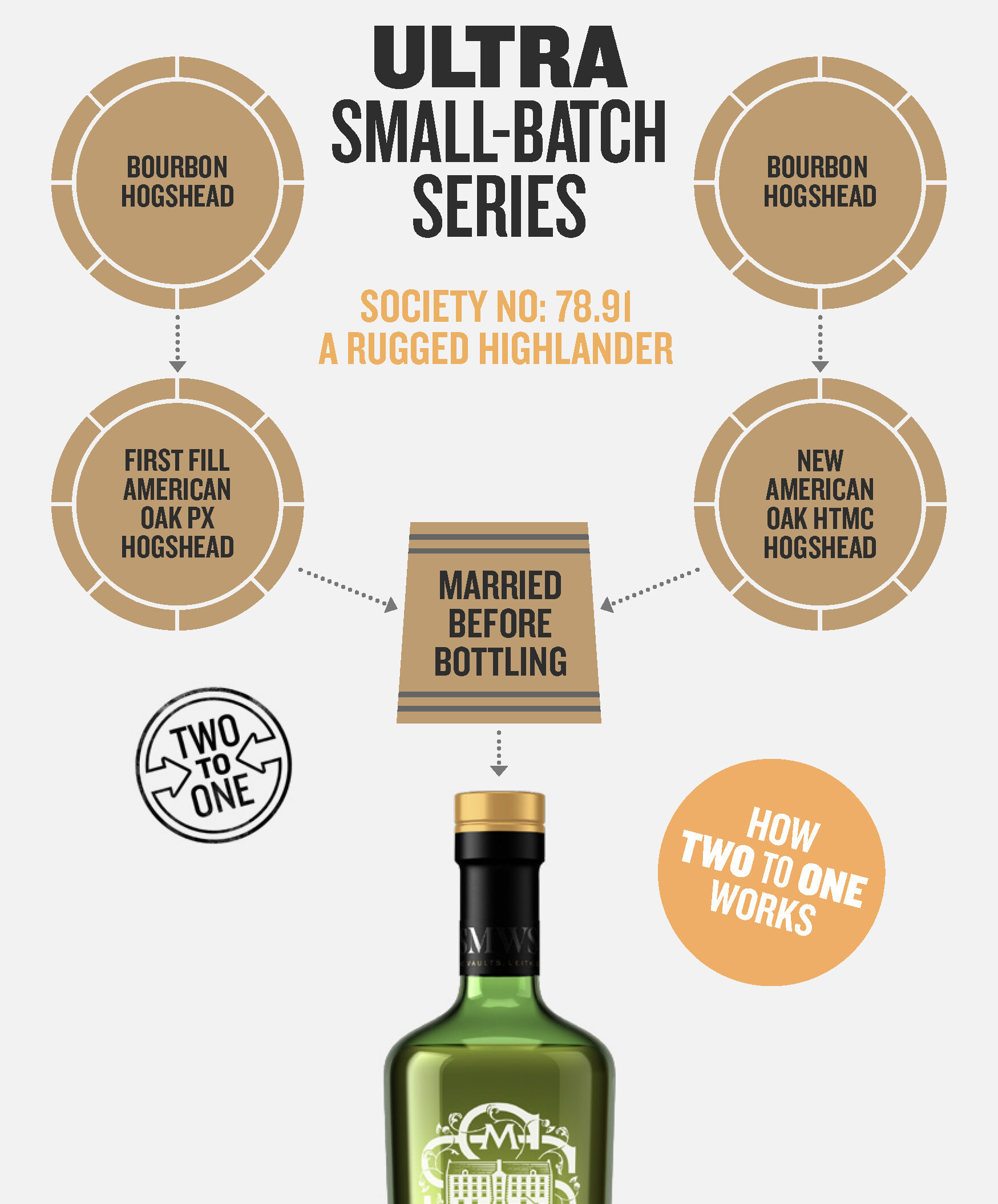 On average there will be around 500 bottles of each Two to One release available, basically the contents of two hogsheads or barrels. Each bottling will be in the Society’s usual green glass with a regular bottling code, but look out for a Two to One stamp on the label. There will also be information about its history and the journey that the whisky has undertaken in its Tasting Notes, as well as detailed infographics to clearly outline that journey.