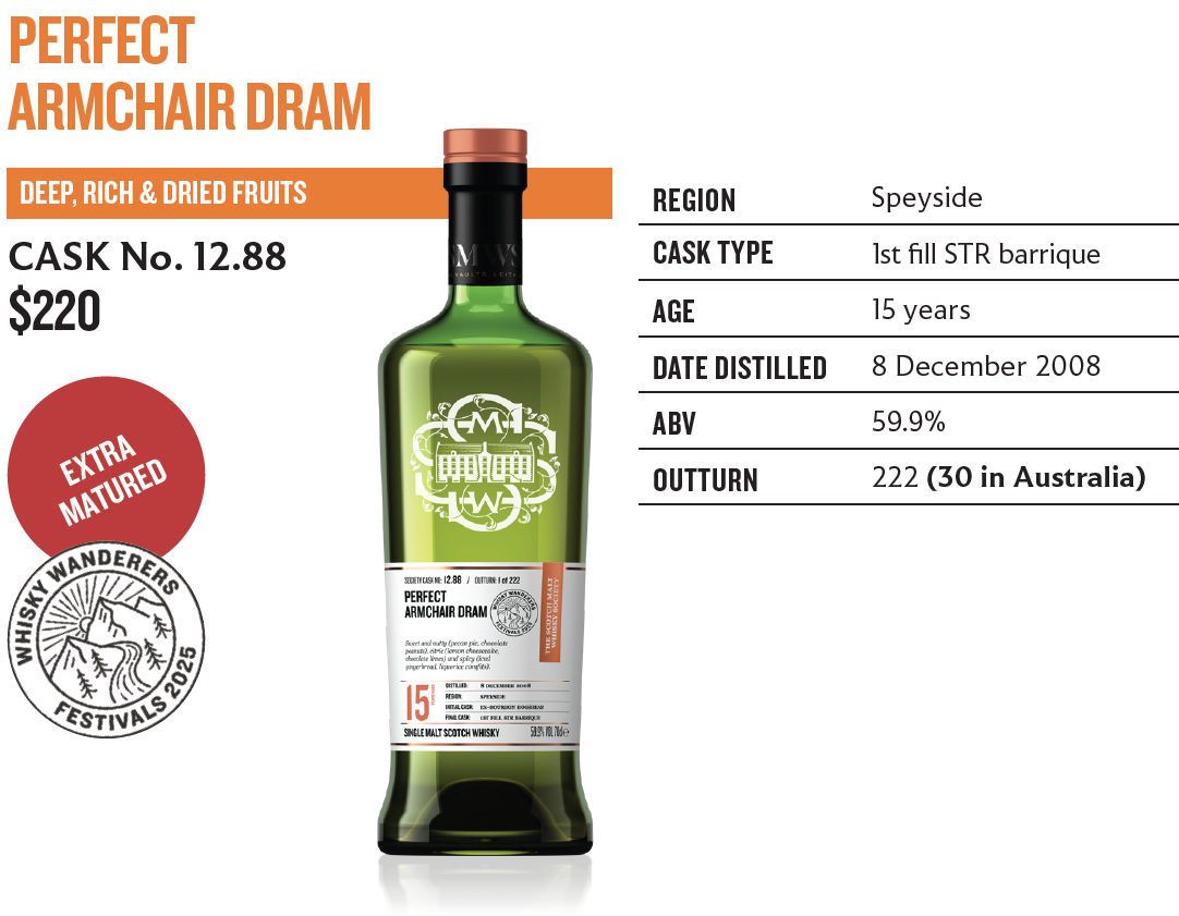 The nose was a party mix of chocolate raisins, chocolate peanuts, foam shrimps and liquorice comfits, treacle tart, pecan pie and chargrilled pineapple. The impactful palate combined blackcurrant jelly and rhubarb pie with dark chocolate, grated coconut and spun sugar; then iced gingerbread, black pepper, aniseed, clove and wine-stained oak produced a wave of spice. The reduced nose mingled the sweet and citric notes of chocolate limes, lemon cheesecake and orange liqueur. The palate, with chocolate brownies, espresso, rose Turkish delight and a dry, nutty, wine-leather finish, seemed the perfect armchair dram. After 12 years in ex-bourbon wood, we transferred this whisky to a first fill American oak barrique with new toasted heads.
