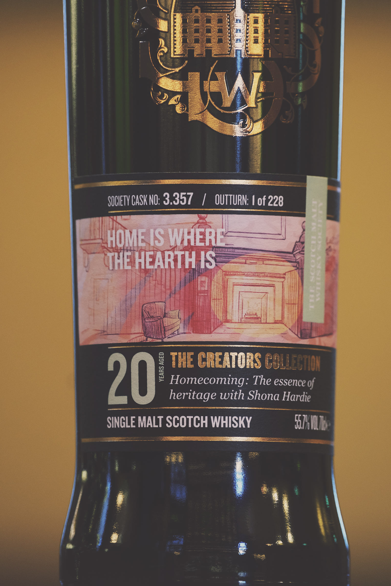 Shona’s first label, for Cask 3.357 Home is where the hearth is, was inspired by the fireplaces in The Vaults, a place where members have enjoyed many drams over the years. “This one went through quite a few iterations,” says Shona. “I came in one evening by myself and sat with my sketchbook and drew the fireplace and drew some people sat around that fireplace. I had a feeling of what it’s like to be here when the members are around and enjoying the setting.” The rest developed organically, she says.