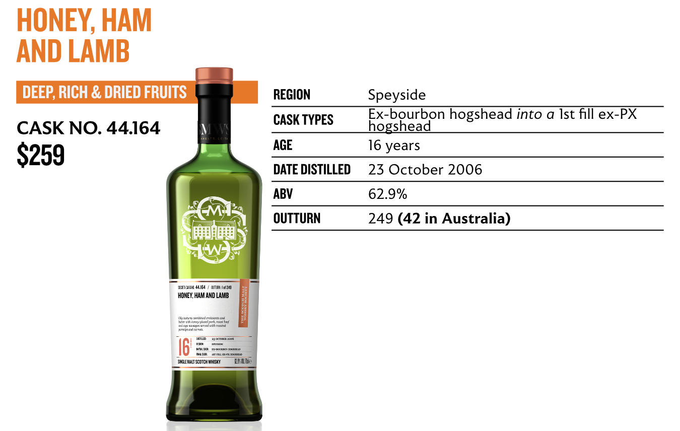 Cinnamon butter melting on warm croissants joined salted caramel and heather honey while Iberico ham and glazed pork were served with green melon. Custard tarts emerged on the palate before chestnuts and praline combined with apple pie richly flavoured with cinnamon, nutmeg and orange skin. Deep notes became amplified with water as roast beef, grilled haggis, and sage and cranberry sausages joined leather and sandalwood incense. A thick and viscous texture now wrapped around roast lamb and glazed pork while parsnips and carrots were roasted with cinnamon and nutmeg. After 12 years in an ex-bourbon hogshead, this was transferred to an American oak Pedro Ximénez hogshead.