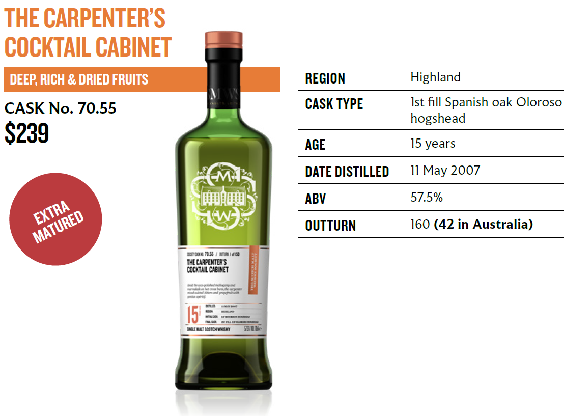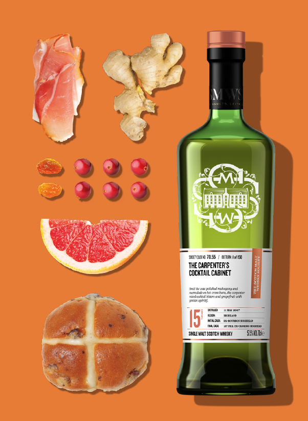 In the woodworking workshop, amid the perfect grain of wax-polished mahogany and varnished veneer, sat a tin lunch box brimming with smoked ham, marmalade on buttered hot cross buns and a thick slice of orange drizzle cake. A selection of jars contained homemade ginger wine, fermenting perry and sultanas soaking in cognac. The carpenter added a few drops of water to a glass, followed by cocktail bitters, orange brandy and a gentian-infused apéritif, before agitating the mix in a freshly carved cocktail shaker with bitter orange and grapefruit. Finishing with a dash of oloroso sherry and a garnish of red berries, the carpenter sat among the sawdust for a well-earned break. After 12 years in an ex-bourbon hogshead, this was transferred to a first fill Oloroso hogshead.