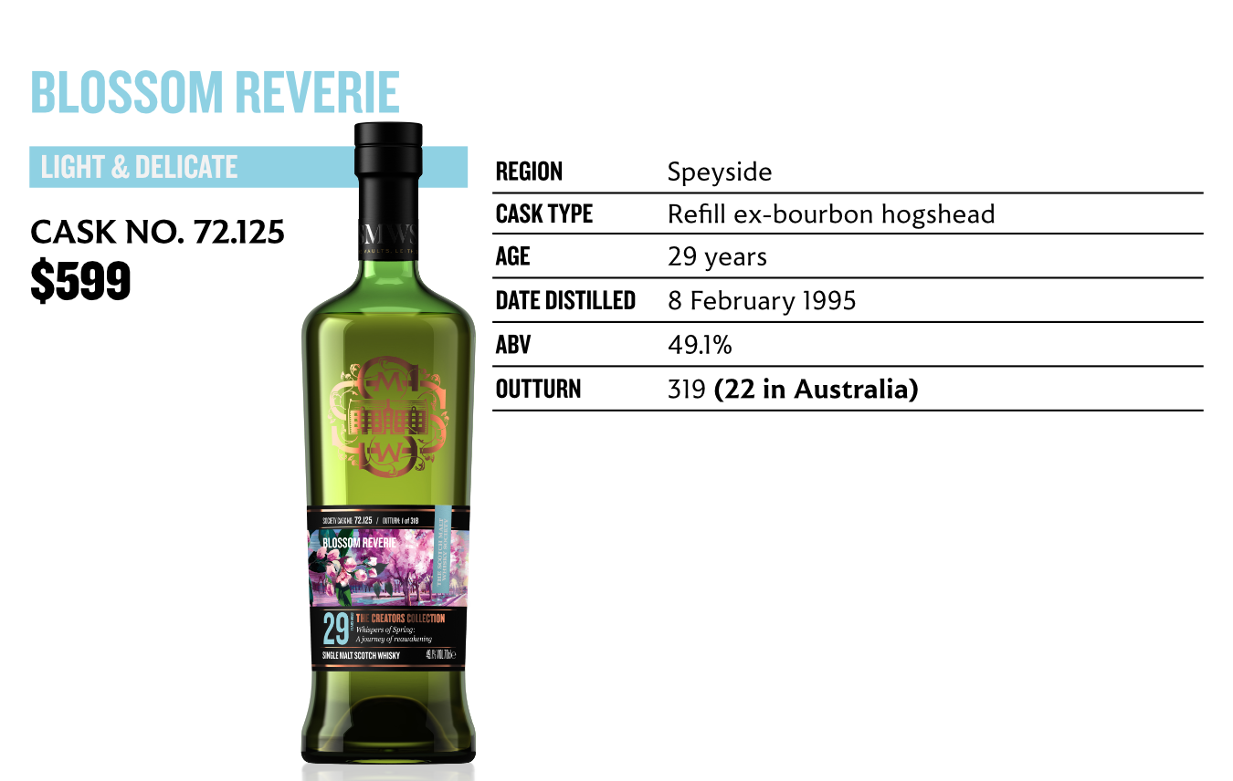 Inspired by the blooming orchards that herald the arrival of spring, Cask 72.125 Blossom reverie is a tribute to the fragrant blossoms that adorn the Speyside landscape. Falling into the Light & Delicate flavour profile, this dram evokes the daydreams of spring, where the air is filled with the promise of new beginnings and the joy of rediscovery. Coming in at a natural cask strength of 49.6% ABV, this bottling is another addition to the Society’s range of USBs and was vatted at 28 years before being matured in a refill bourbon hogshead for a further year. After nosing, the Tasting Panel found a heavenly mix of golden syrup, honeycomb and milk chocolate biscuits. On the palate: a sprinkle of brown sugar tantalised the tongue before being joined by bursts of lime and chamomile petals.