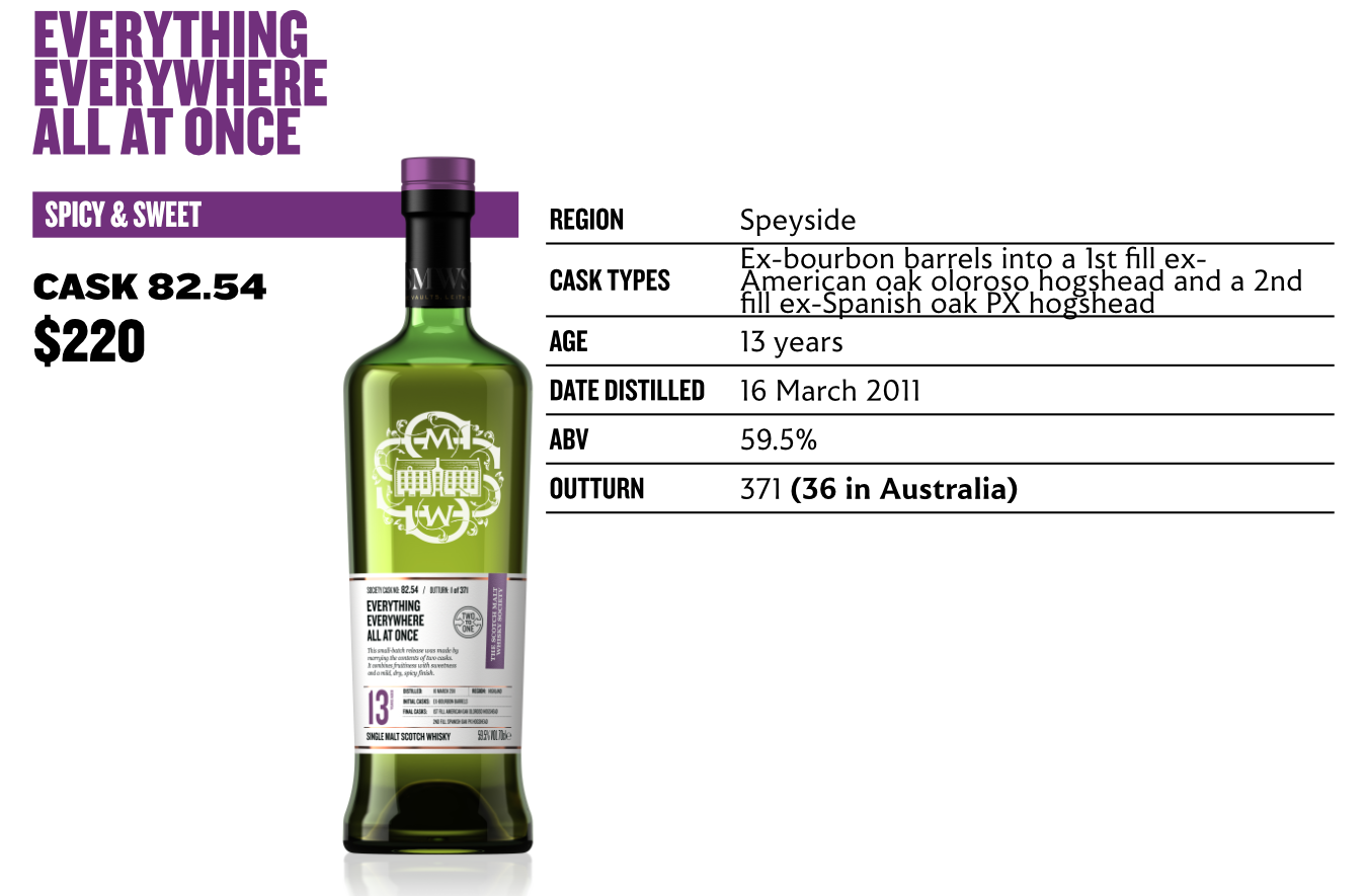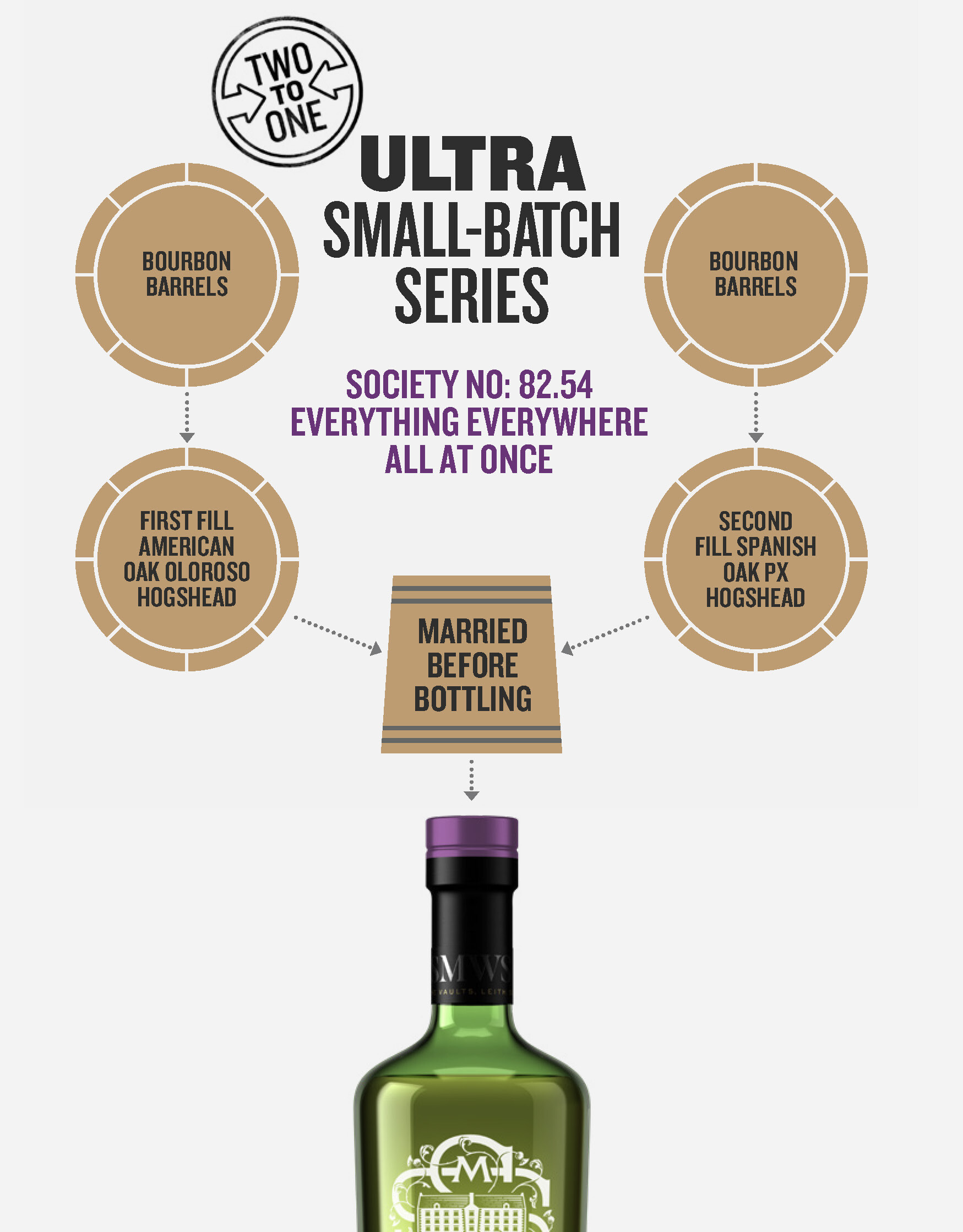 The starting point for this small batch was two bourbon barrels of single malt Scotch whisky. We transferred one into a first-fill American oak oloroso hogshead and the other into a second-fill Spanish oak PX hogshead. The casks were then married together before bottling. The nose turned out fresh and fruity – fruit chewing gum, honeydew melon, orange and pear drops, with complicating elements of beeswax, lemongrass and chamomile, plus the promise of sweetness: crème brûlée, banoffee pie, white chocolate and foamy bananas. The palate gave us sherbet lemons, candied nuts and syrupy pears and peaches, with a dry finish of eucalyptus, tobacco, sweet chilli, cinnamon and cassia bark.