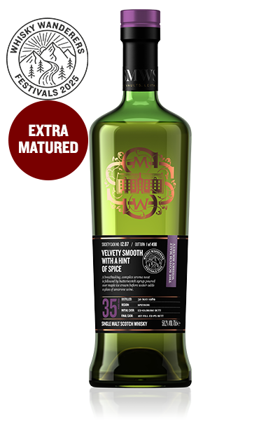 An intriguing melange of aromas excited the Panel. The scent of sandalwood and cedar was joined by well-brushed leather boots, tobacco and aged plum brandy. On the palate we found layer upon layer of dark fruits such as blackcurrants and blackberries spiced with a chilli jam of cloves, ginger, star anise and demerara sugar. Following a drop of water we were served a slice of toasted stollen with butterscotch sauce next to spiced sultana griddle scones. To taste, damson and sloe gin jam accompanied maple syrup on thick American pancakes. Following 28 years in an ex-oloroso butt, we transferred this whisky into a first fill Spanish oak PX butt.