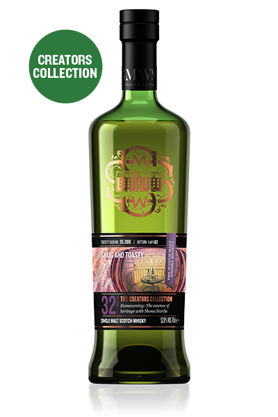 Treacle scone topped with hot-smoked salmon: that was the first impression of the Panel! This quickly evolved to include raw ginger cake batter, sauna wood, smoked almonds and shellfish broiled with seaweed. Water brought pickled sushi ginger, smoked sea salt and a sharp, mineral edge, plus lots of Asian vibes such as soy sauce, eel sushi, bonito flakes and wasabi. The neat palate detonated with wakame, balsamic, smoked prawns, ginger biscuits, barbecue-charred plums and seared beef. Water made it really fantastic, with brined herring, toasted sesame and a lovely, drying waxiness. The starting point for this small batch was two bourbon hogsheads of single malt Scotch whisky. They were each transferred to new casks at five years old. One cask was a first fill American oak PX hogshead, while the other was a second fill oloroso hogshead. The casks were then married together before bottling.